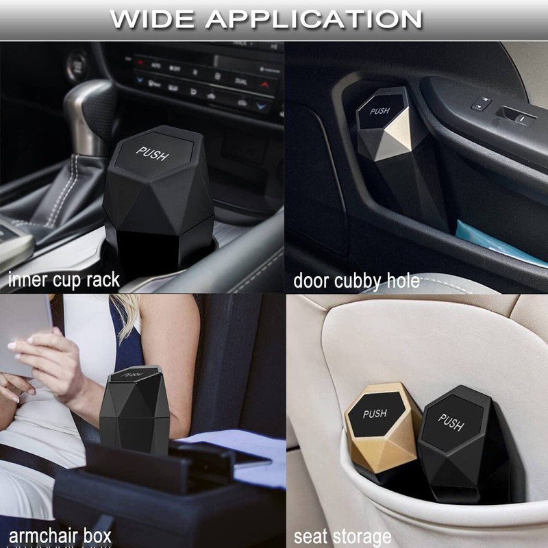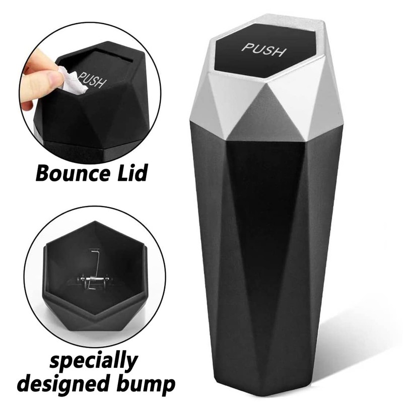 - 【Easy to use】: Car Garbage Can with a press-type design, the garbage can be easily put in with a simple press.The easy-bounce ''PUSH'' lid can be opened or closed effortlessly, and the improved spring clasp is more stable. This thoughtful design can firmly lock the odor in the trash can.