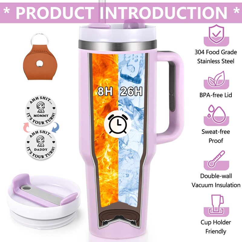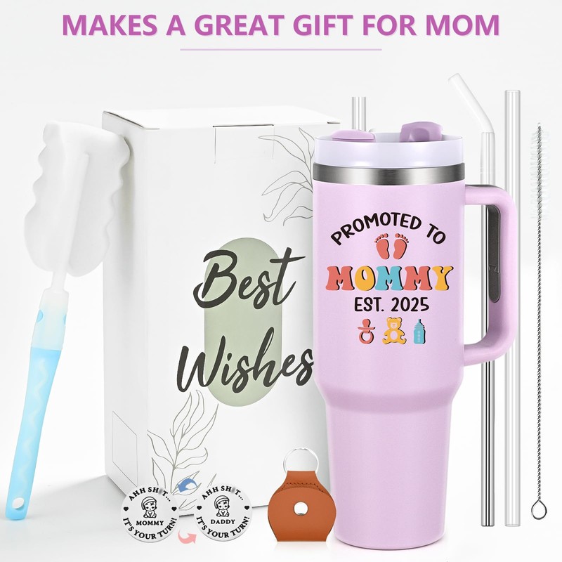 Qtencas - Vaso de acero inoxidable con asa, regalo del día de la madre para mamá nueva madre, 40 onzas, promocionado a mamá Est, 2025, color morado