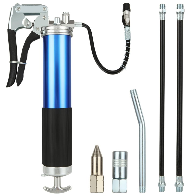QTLCOHD Grease Gun Kit, 7000 PSI Heavy Duty Grease Gun with Grease Coupler, 14oz Pistol Grip Grease Gun with 12 Inch Spring Flex Hose, Sharp Nozzle, Extension Rigid Pipe, Blue