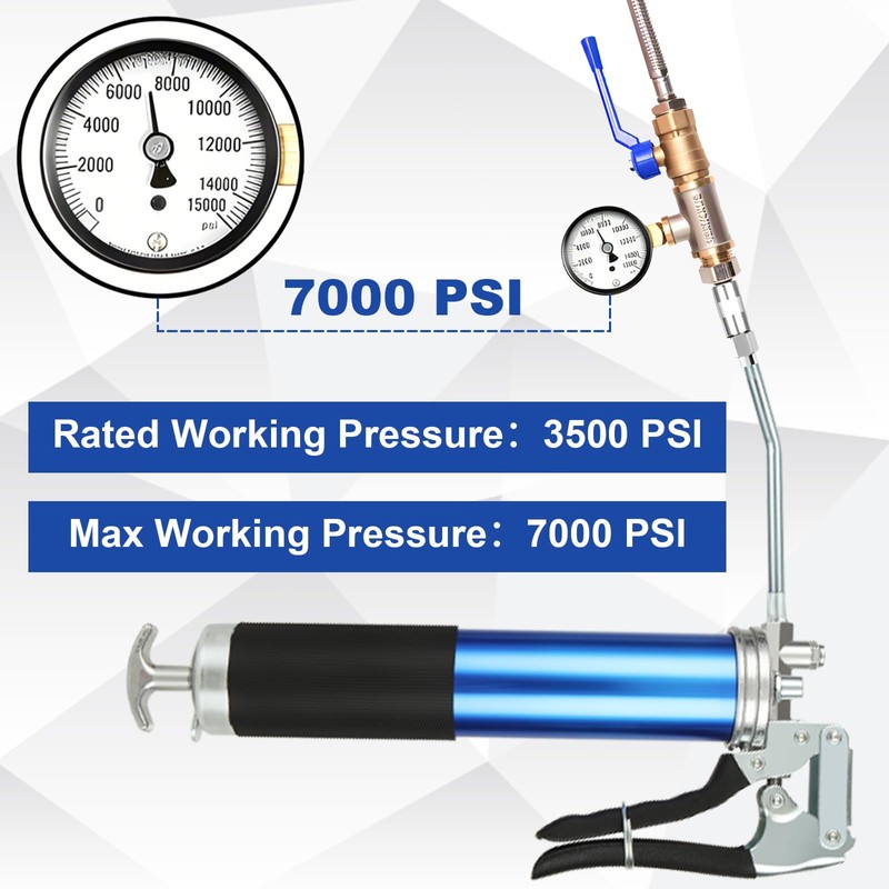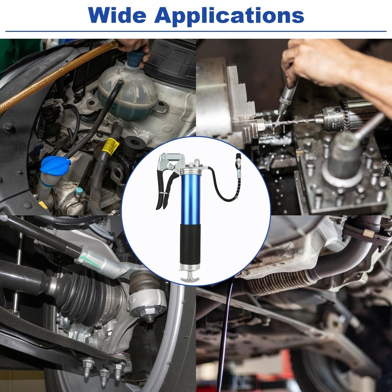 - Wide Applications: Our pistol grip grease gun can handle up to 7000 PSI of working pressure, allowing you to tackle high-pressure lubrication tasks without worrying about grease jams. It is perfect for lubricating vehicles, tractors, steering cylinders, RVs, power output shafts, universal joints, suspension cross ties, ball joints, lawn mowers, chassis, and drive shafts