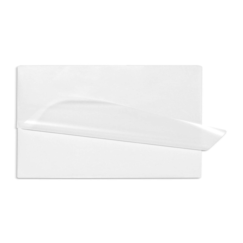 500 3-1/4 x 4-3/4 (83mm X 121mm) hot thermal (heat activated) clear glossy finish laminating pouches. 10 mils (250 microns) thick in each flap and sealed on just one edge. These pouches have standard 1/8" radius rounded corners. Quality meets or exceeds all major brands, but at generic pricing. 500 pouches per box packaging includes at least 5 silicone coated laminating "carriers". Maximum card size recommended for this pouch is 3" x 4-1/2" (or less) to leave a standard 1/8" border of clear laminate around card for a secure sealed edge.