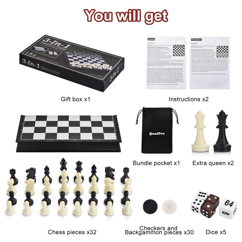 - 【HIGH QUALITY】QuadPro 3-in-1 chess board game set Made of durable HIPS plastic with Fine texture, gives you smooth hand-feel while lightweight and portable; well-crafted chess pieces make it much more deluxe.