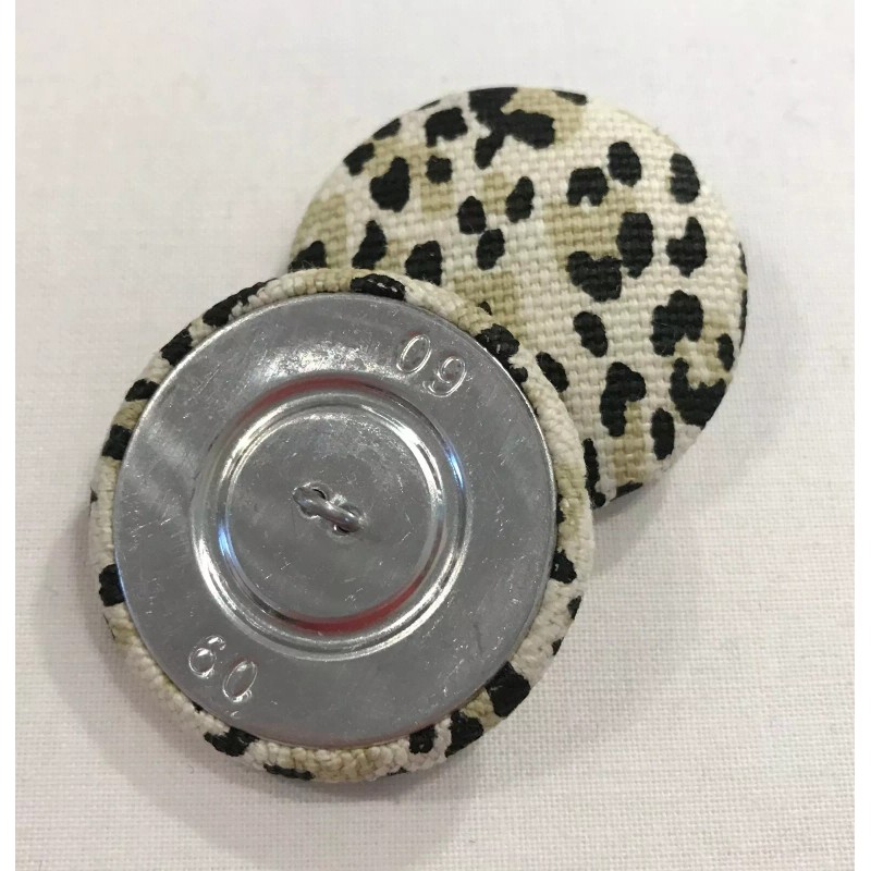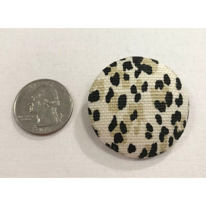 This listing is for two custom buttons made from a linen cotton leopard print fabric from Quadrille entitled "Bonaparte". Quadrille design #305086F color taupe black (black and tan spots on winter white). This is a current pattern and colorway. The buttons measure approximately 1.5" diameter. There are 16 sets of two buttons available. These buttons are made on a professional die cut and crimp button machine. They are NOT your home made hammered buttons that are bought at your local craft store. They are NOT mass produced buttons. Each button was hand produced by Walsh Designs. The button patterns are random and no two are alike. The face of the buttons are made from Quadrille's linen cotton leopard print fabric entitled "Bonaparte". This fabric retails for $262.00 a yard. The buttons are a metal crimp button with a shank back. These would make a great addition to drapes, pillows or even clothing. Don't forget to check out other listings for more fabulous fabrics, trims and home accessories. Happy Decorating!!