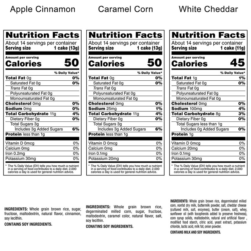 Made with the delicious goodness of whole grain brown rice, and baked to crispy perfection. With tons of great flavors, and 50 calories or less per cake, there's one perfect for every snacking occasion. Or even make one into a meal. This new variety pack includes 2 bags of each of three of our most popular flavors - White Cheddar, Caramel Corn, and Apple Cinnamon.