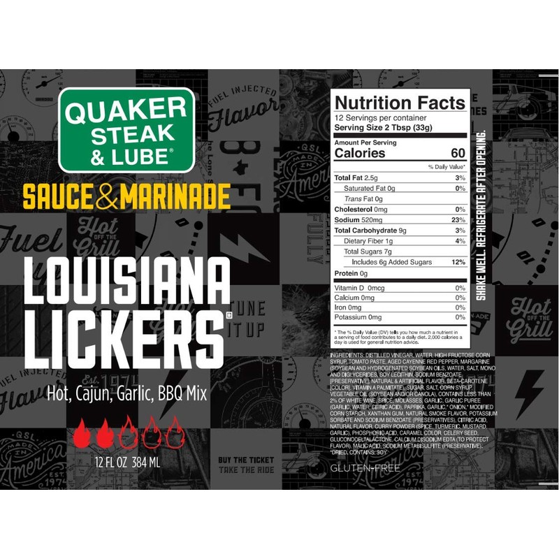 - TWO BOTTLES OF QUAKER STEAK & LUBE Louisiana Lickers Buffalo Wing Sauce in 12 oz Glass Bottles.