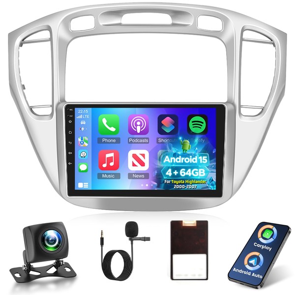 [Qualcomm 8 Core 4+64G] Android 15 Car Radio for Toyota Highlander 2000-2007 - Wireless Carplay and Android Auto - 9 Inch 1280 * 720 IPS Touchscreen Car Stereo - DSP/GPS/SWC + AHD Backup Camera
