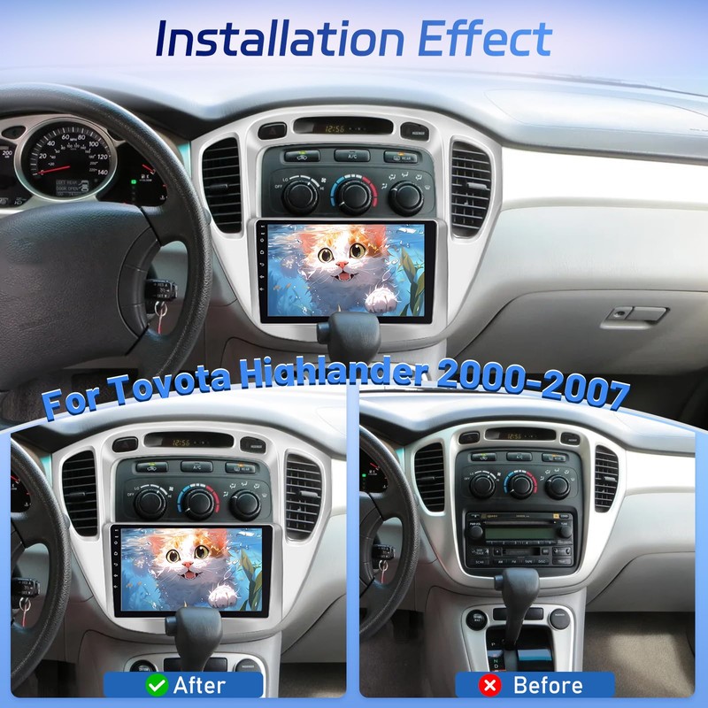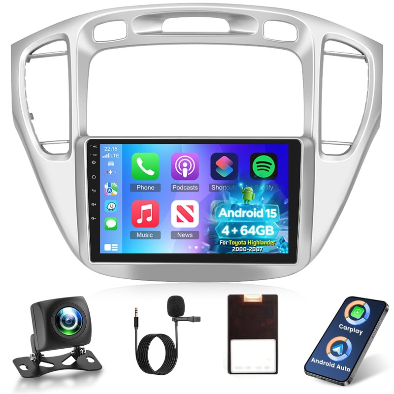 - For Toyota Highlander Radio: This carplay radio is compatible with Toyota Highlander 2000 2001 2002 2003 2004 2005 2006 2007. It is equipped with rich intelligent functions to bring a smooth driving experience. You can enjoy GPS Navigation / WiFi & Phone Hotspot Connection / Online and Offline Maps / Custom Home APP Display / Split Screen / Mirror Link / Built-in and External Microphone / 1080P Video Playback and other functions
