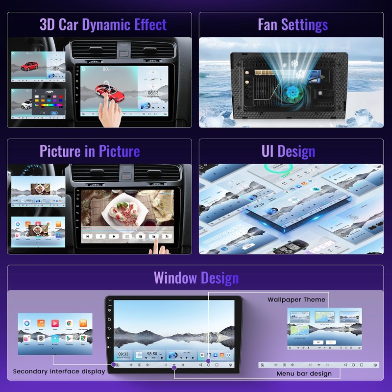• [Android 13 & Personalized UI Design]: Equipped with smooth, modern Android 13 system with a customizable UI. The home screen features date/time, FM and music widgets, 5 recent apps, and an intuitive menu bar with volume and navigation controls. A 3D car model section lets you rotate the view 360°, and personalize vehicle color and rim style for a truly tailored experience.