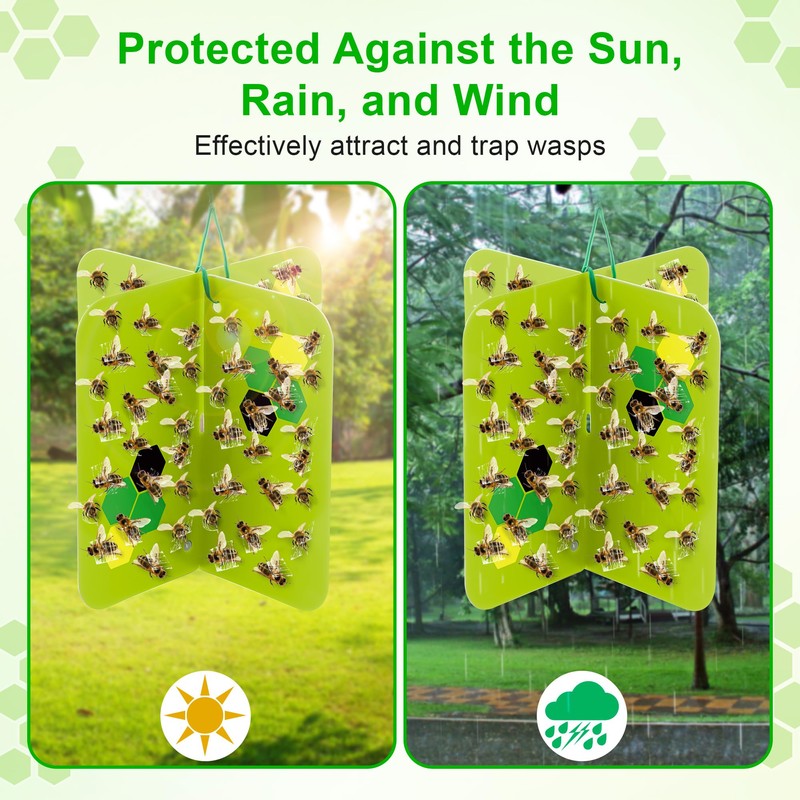 - Strong Adhesion: Our bee traps for outside use a powerful adhesive formula to catch virtually all bugs. The bee traps outdoor hanging are protected against rain and wind. Once insects are attracted to them, they become stuck to the sticky surface and die. These wasp catchers remain effective until they are completely filled with insects, eliminating the need for frequent replacement