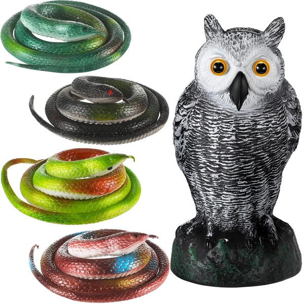 - Snake and Owl Bulk: we will provide you with 4 pieces realistic fake rubber snakes and 1 piece owl garden statue, 5 pieces are in total, snakes are in 4 colors, enough for you to choose and use