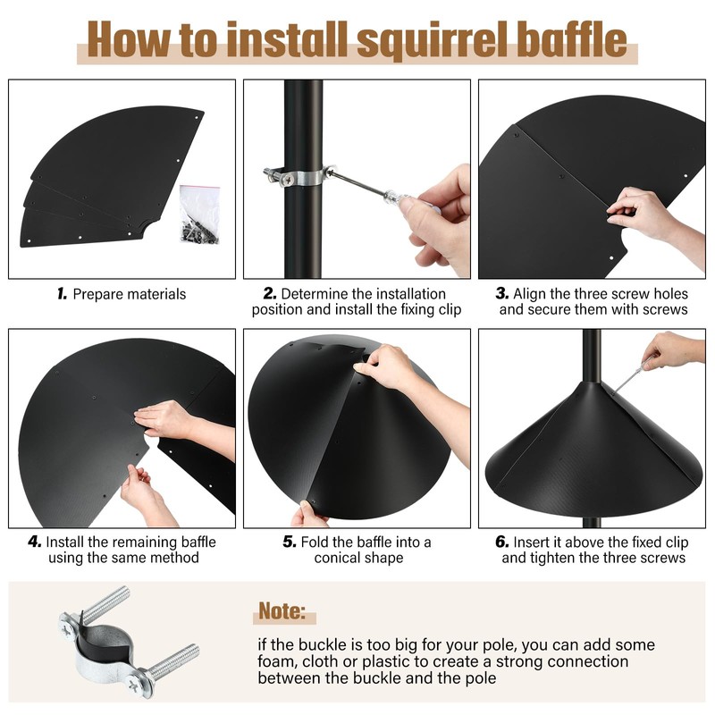 • Easy to Installation: the squirrel baffle for bird feeder pole is designed with 3 plates and the required tools are included, easily attaches to the bird feeder pole; The buckle can accommodate rods between 0.71inch and 1.1inch in diameter; A pair of long screws and short screws are included; Please check the picture carefully during installation, note: if the buckle is too big for your pole, you can add some foam, cloth or plastic to create a strong connection between the buckle and the pole