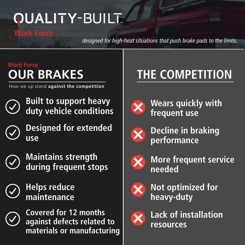 - HEAVY DUTY PADS MADE WITH HEAVY DUTY MATERIALS: Stopping faster means a safer ride. Whether you’re taking your hauling your tools or kids to soccer practice, Quality-Built Work Force brake pads have you covered.
