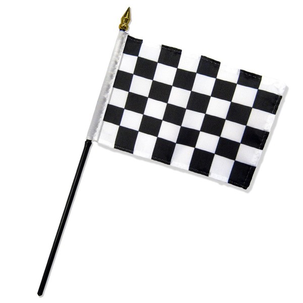 4x6 inch Black & White Checkered Stick Flag is perfect for displaying on your desk or table, or for waving in a parade to show your national pride. All of our 4x6 inch flags are mounted on a 10.5 inch plastic stick with a metallic golden spear top. Flag is made from 100% polyester and printed in bright colors. Each flag is individually sewn around the edges.