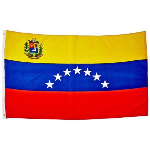 3x5ft Polyester Venezuela (7 stars) Flag has header tape and 2 metal grommets. Flag is dye-sublimated with beautiful bold colors. Printed on one side all the way through the fabric, Double-stitched around all edges with 4 rows of stitching on fly edge.
