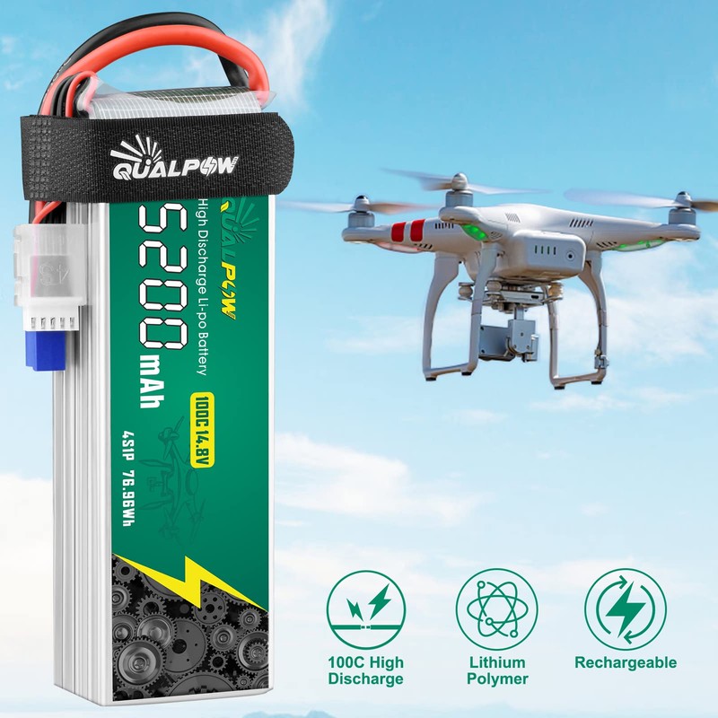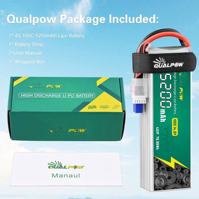 • 🔋【Qualpow 4S LiPo Battery Specification】 -- Battery voltage: 14.8V; Configuration: 4S1P; Cell voltage: 3.2~4.2V; Capacity: 5200mAh; Discharge: 100C; Plug: EC5 Connector; Electricity: 76.96Wh.