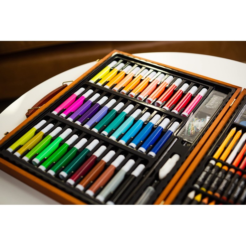 - The attractive wooden case includes a matching handle and metal latches to close, making this drawing kit easy to transport.