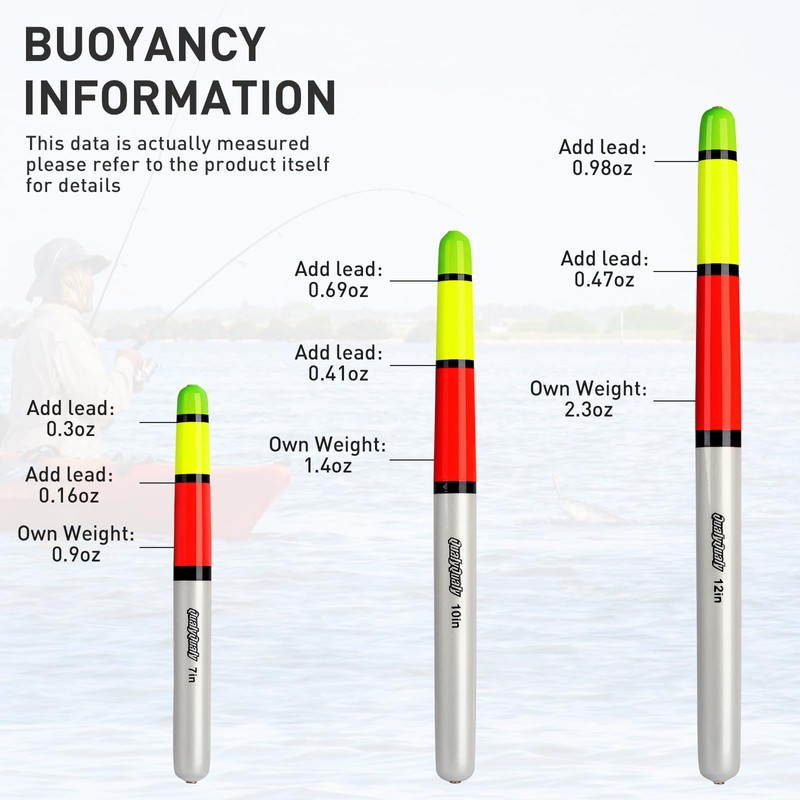 - Weighted Pole Float: QualyQualy catfish pole float is weighted to make long casts with ease. The perfect aerodynamic design of the fishing float is your ideal choice for delivering big baits to big fish. Add appropriate weight according to different size of the fishing pole float to avoid the weighted float not being able to surface or sinking insufficiently.