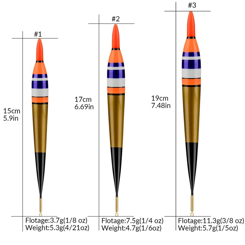 - 4.What's in the box? 3PCS #3 Fishing Floats and 3 Pcs CR425 Battery. Size 3,Total Length:18cm/7in,Body Length:9cm/3.5in,Body Dia:17.3mm/0.68in,Tail Dia.:7.55mm/0.3in,Weight(self):5.9g/0.21oz,Buoyance:11.3g/0.4oz.NOTICE:Random Color (Red or Green) Delivery for the Light,thank you for your understanding.