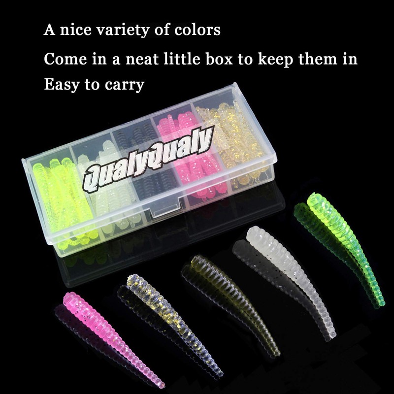 - 1.A Wide Variety Of Colors: Nice package of artificial baits from QualyQualy,good assortment of color, This kit contains different colors of fishing lures, they also come in a neat little box to keep them in and easy to carry. Micro tail plastic fishing lures are made of quality materials making them last longer. Very soft lure,well made,do not easy to beat up or torn, do not easy to split.