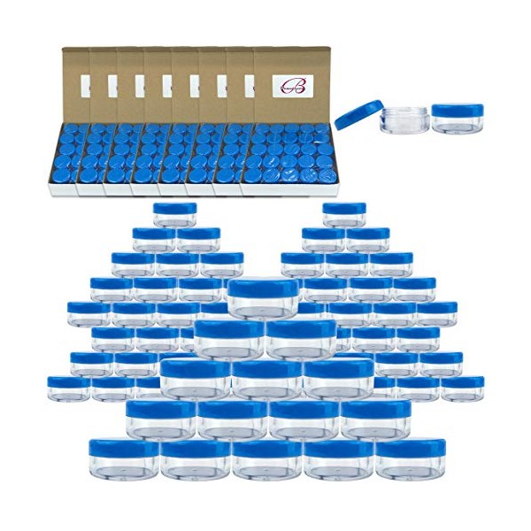 (Quantity: 1000 Pieces) Beauticom 5G/5ML Round Clear Jars with BLUE Lids for Scrubs, Oils, Toner, Salves, Creams, Lotions, Makeup Samples, Lip Balms - BPA Free
