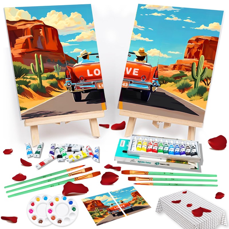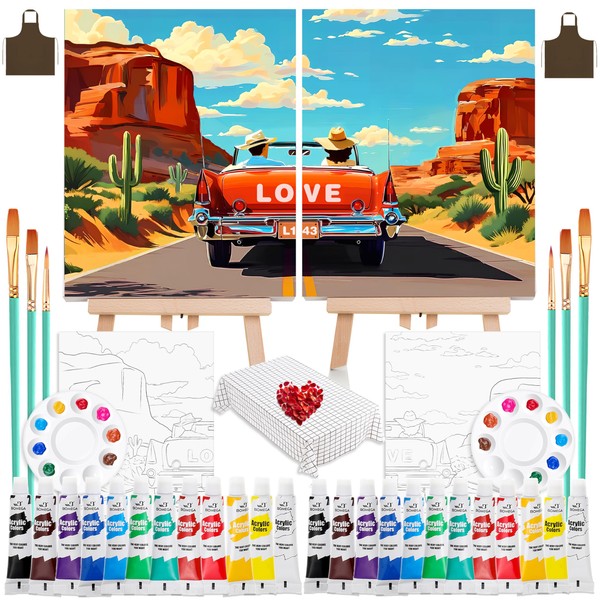 QUANWAISJ 2 Sets 10x12 Couples Painting Kit Date Night, Sip and Paint Kit for Adults with Pre-Drawn Canvas (Easels Included), Perfect for Date Night Painting and Sip Parties (Road Trip)