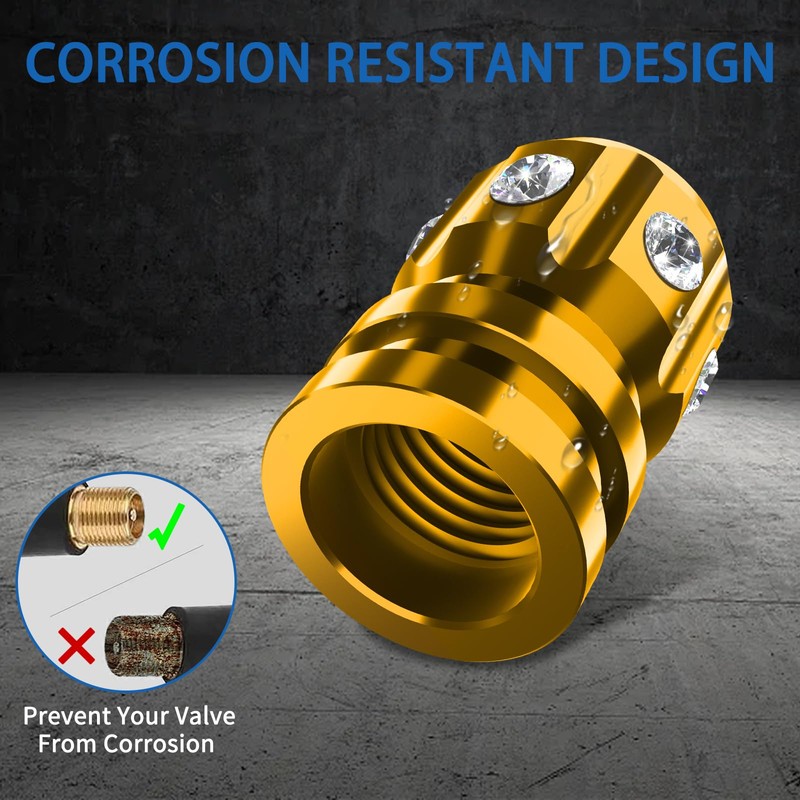 QUARKACE Tire Valve Caps, Bling Valve Stem Caps with Sparkly Rhinestones, Tire Caps 4 Pack for Cars SUVs Trucks Motorcycles Bikes, Anti-Fading Coating, Corrosion Resistant, Air Leakproof - Gold