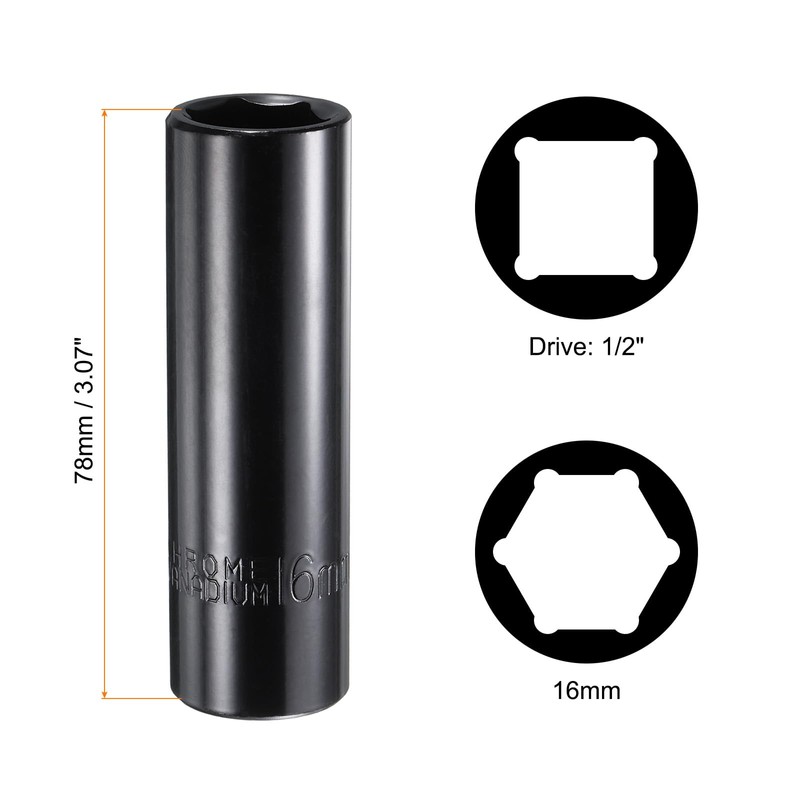 - Specification: Drive: 1/2"; Depth: 16mm; Total Length: 78mm/3.07"; Package Includes: 1 x Deep Impact Wrench Socket Wrench.