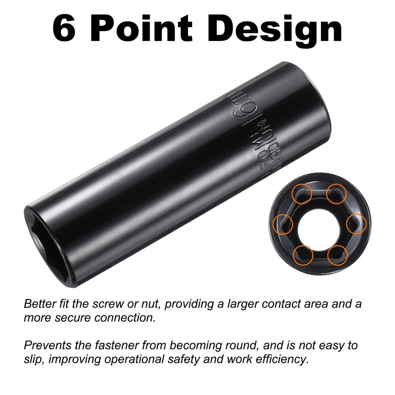 - 6 Point Design The connection of the impact wrench socket wrench has a hexagonal structure, which better fits the hexagonal head of the screw or nut, provides a larger contact area, and ensures a safer connection. It has a stronger handle when in use, prevents the fasteners from becoming round, and is not easy to slip, which improves operational safety and work efficiency.