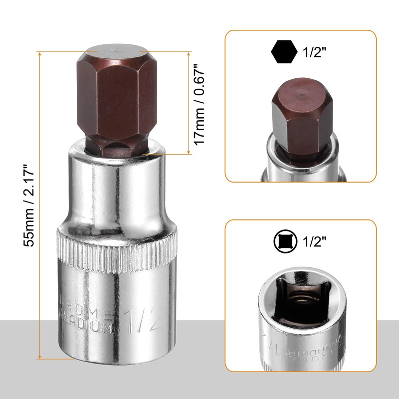 - 【Size and packaging】 Drive: 1/2"; Socket Size: 1/2"; Total Length: 55mm/2.17"; Bit Length: 17mm/0.67"; Package Includes: 1 x Hex Bit Socket.