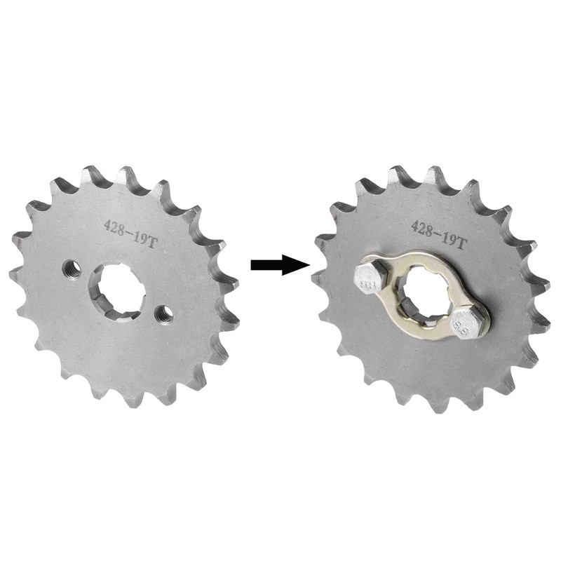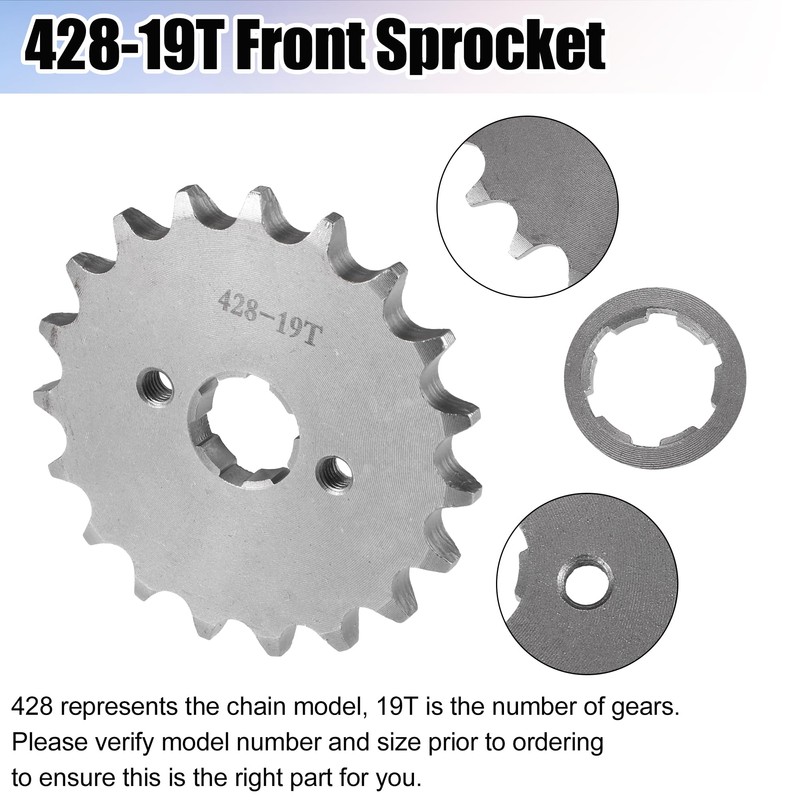 - Note: 428 stands for the chain model, 19T is the number of gears, 20 mm is the size of the mounting hole. Please check the model number and size before ordering to make sure this is the right part for you.