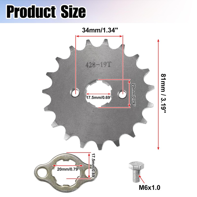 - Size: front sprocket 428, chain 19 teeth, 20 mm. Eye-to-eye Center Length:34mm/1.34", Mounting Hole Diameter:20mm/0.79", Gear Inner Diameter:17.5mm/0.69".