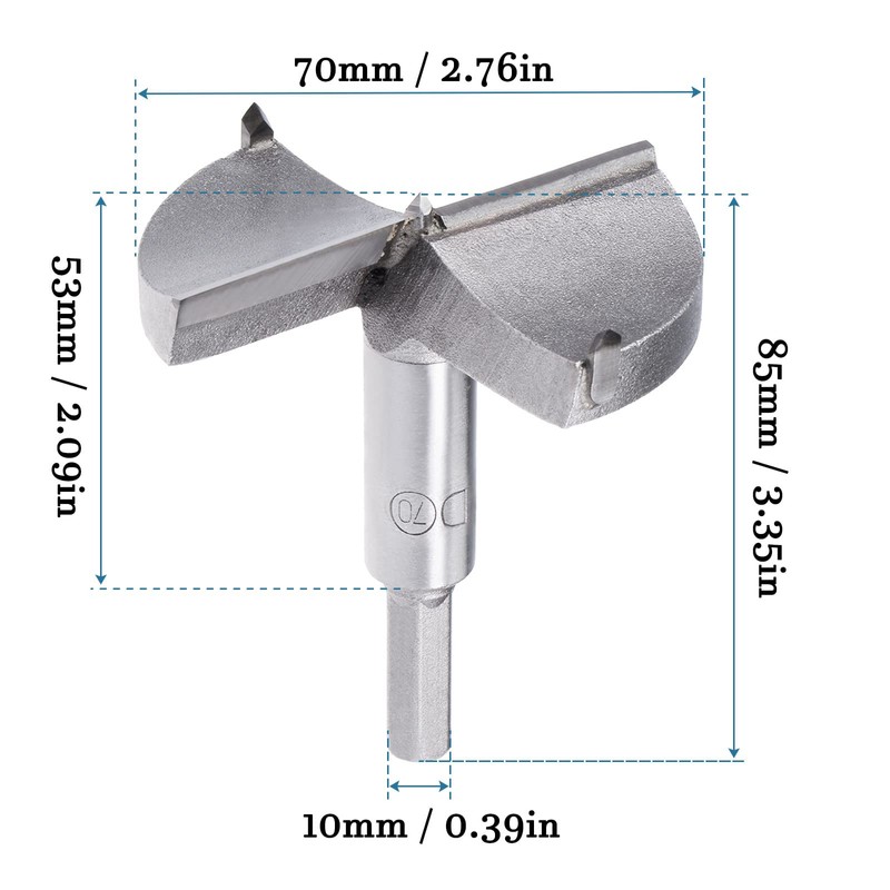 - ! Size - drill diameter: 70 mm / 2.76 inches; shaft diameter: 10 mm / 0.39 inches; drilling depth: 53 mm / 2.09 inches; total length: 85 mm / 3.35 inches.