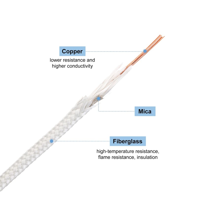 - Wire diameter: 4 mm / 0.16 inches; Wire length: 10 metres / 32.8 feet; Wire specification: 2.5 mm²; Maximum temperature: 500 degrees Celsius; Colour: white; Material: copper, mica, glass fibre; in the packaging: 1 roll x high temperature wire
