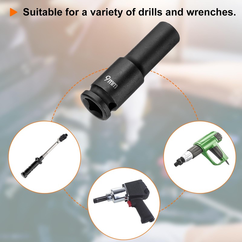 - Size - Square Drive: 3/8"; Metric 6 Point Socket: 9mm; Total Length: 65mm / 2.56". The specification is clearly marked on the surface of the socket, which facilitates identification and improves work efficiency.