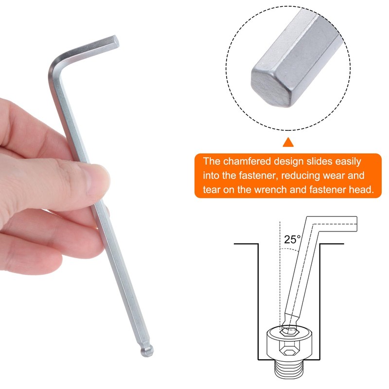 - Chamfered - Beveled hexagonal ends allow for easy sliding of fasteners and reduces wear on keys and fastener heads. With a ball head to access hex socket screws with an entry angle of up to 25 degrees, makes it easier to adjust in hard-to-reach angles.