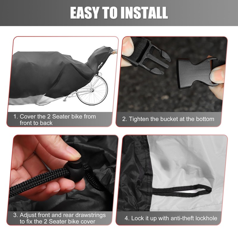 - Lightweight rain cover - Made of 210D Oxford fabric with PU material, which protects your bike from scratches, the inner surface adds a waterproof coating, and the 2 seater bike covers are made of lightweight material and easy to carry, good durability.