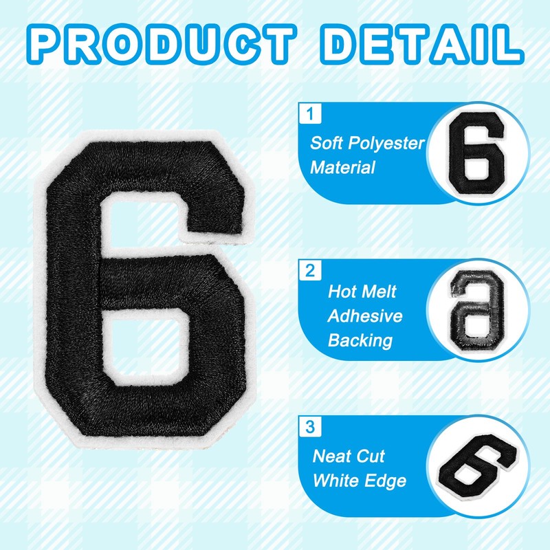 • 1. Die Aufbügelpatches bestehen aus hochwertigem Polyester mit exquisiter Verarbeitung und hoher Haltbarkeit, sind angenehm zu berühren und waschbar. Der starke Klebstoff mit hitzeversiegeltem Kleber auf der Rückseite ist langlebig und einfach zu verwenden. 2. Der weiße Rand jedes Patches ist ordentlich geschnitten. Verwenden Sie es an Ihren Sachen, um sie zarter und stilvoller zu machen. Verschiedene Nummern stehen für DIY zur Verfügung, sodass Sie exklusive Stile oder Logos erstellen können.