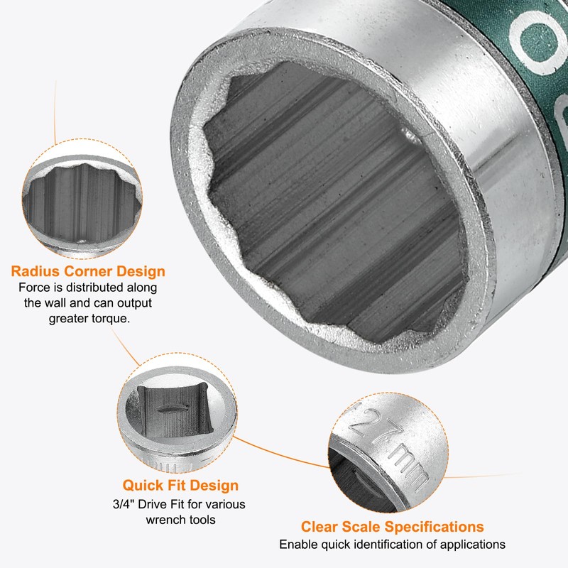 - Size - Square Drive: 3/4"; Metric 12 Point Socket: 27mm; Total Length: 56mm/2.2"; Package Content:1 x 12 Point Socket Specifications are marked on the surface of the impact wrench socket for easy identification and improved work performance.
