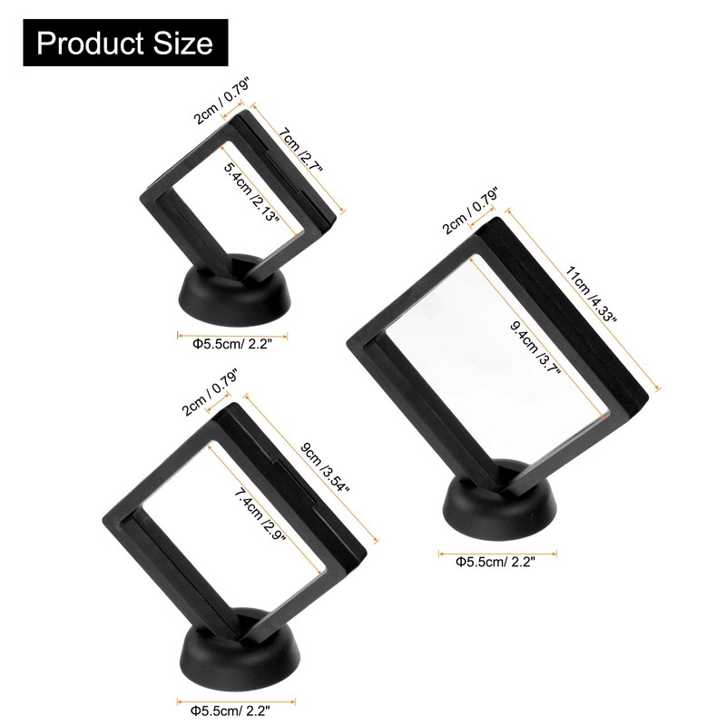 • Package contents: you will receive 1 set (6pcs) floating display cases and stands. Frame size: 4.3"Lx4.3"Wx0.8"H// 3.5"Lx3.5"Wx0.8"H// 0.3"Lx0.3"Wx0.8"H,each size*2pcs; screen size: 3.7"Lx3.7"B//2.9"Lx2.9"B// 2.2"Lx2.2"Lx2.2.2"Lx2...2"Lx2...2"Each sizeeach size *2 pieces. Colour: black