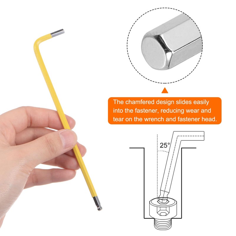 Beveled hexagonal ends allow for easy sliding of fasteners and reduces wear on keys and fastener heads. With a ball head to access hex socket screws with an adjustment angle of up to 25 degrees, makes it easier to adjust to hard to reach angles.