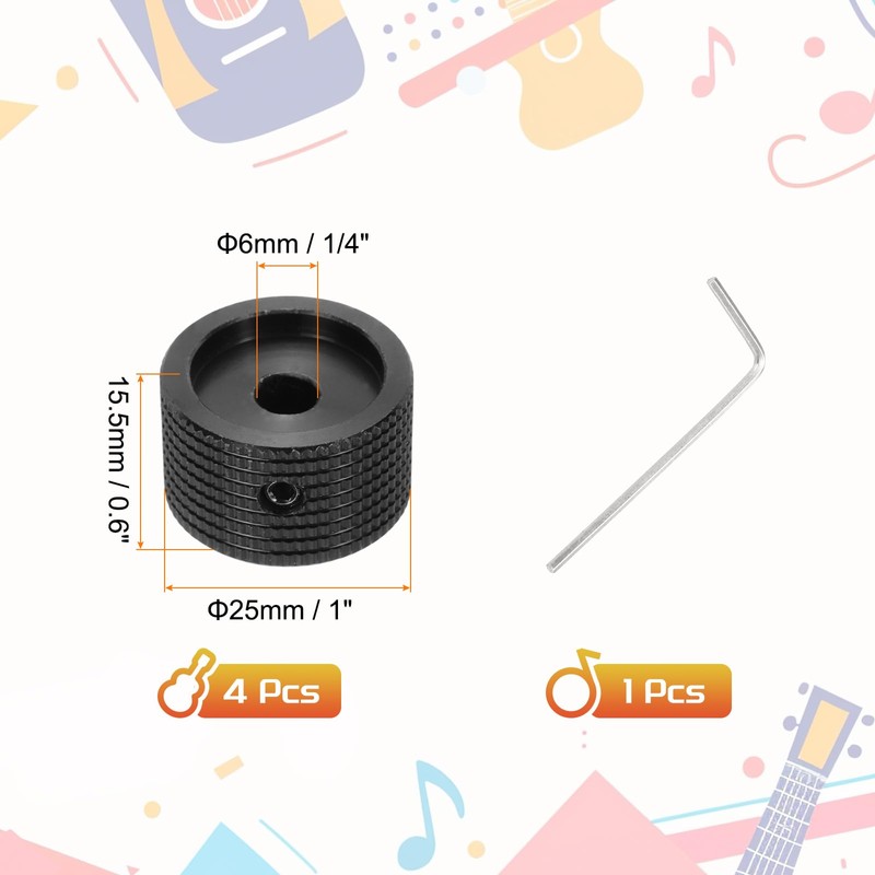 - Metal Guitar Knobs Inner Diameter: 6mm (1/4") Outer Diameter: 25mm (1") Height: 15.5mm (0.6") Color: Black Material: Aluminum Alloy Package Included: 4 x Guitar Knobs 1 x Wrench