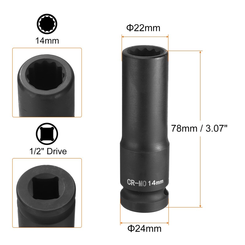 - Size - Drive: 1/2 inch, 6 point socket size: 14 mm, total length: 78 mm / 3.07 inches. The specifications are clearly marked on the surface of the socket wrench, which facilitates identification and improves work performance.
