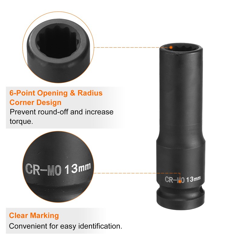 - Größe - Antrieb: 1/2 Zoll, 6-Punkt-Steckschlüsselgröße: 13mm, Gesamtlänge: 78mm / 3,07 Zoll. Die Spezifikationen sind deutlich auf der Oberfläche des Steckschlüssels markiert, was die Identifizierung erleichtert und die Arbeitsleistung verbessert.