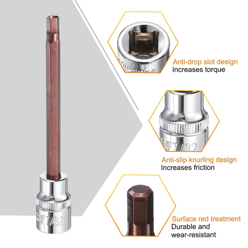 - 【Size and packaging】 Drive: 3/8"; Socket Size: 7/32"; Total Length: 110mm/4.33"; Bit Length: 81mm/3.19"; Package Includes: 1 x Hex Bit Socket.