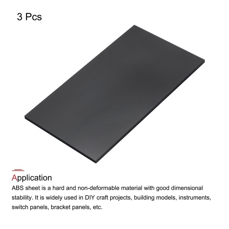 - Pack of 3 ABS plastic panels; Size: 180 x 100 x 4 mm / 7 x 4 x 0.16 inches; Colour: Black; Finish: Smooth.