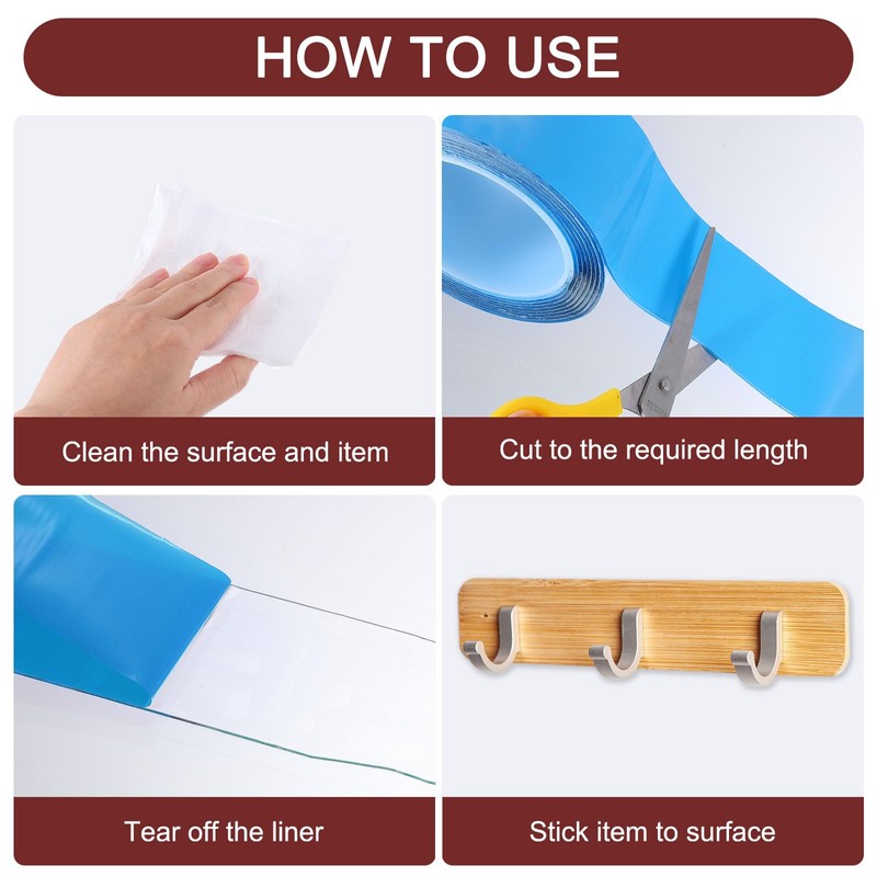 - Merkmale - Das beidseitige Klebeband kann leicht entfernt werden, ohne Gummispuren zu hinterlassen und die Oberfläche nicht zu beschädigen. Das abnehmbare doppelseitige Band kann wiederverwendet werden; einfach mit Wasser waschen und trocknen, um seine Viskosität wiederherzustellen und es erneut zu verwenden.