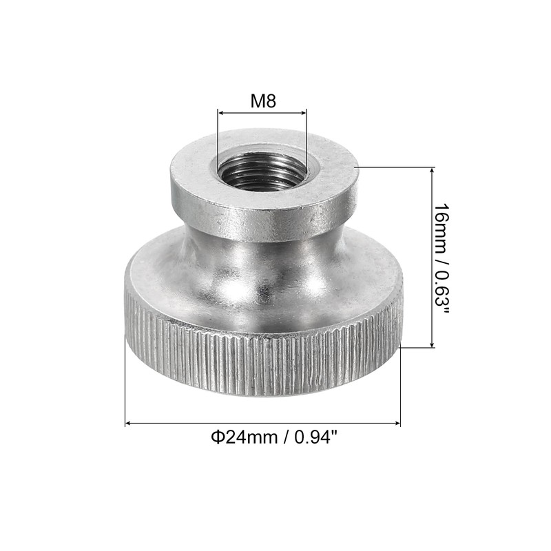 - [Thread Size] M8: Pitch: 1.25mm/0.05"; Large End Diameter: 24mm/0.94"; Total Thickness: 16mm/0.63".