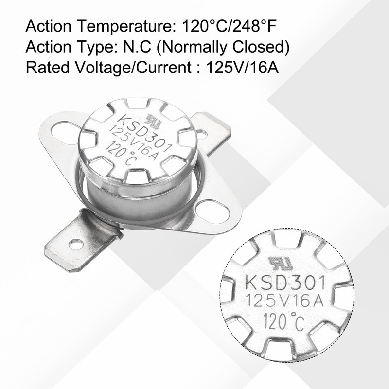 - Type: KSD301 120 Degree Celsius Thermal Control Switch 125V 16A NC (Normally Closed)