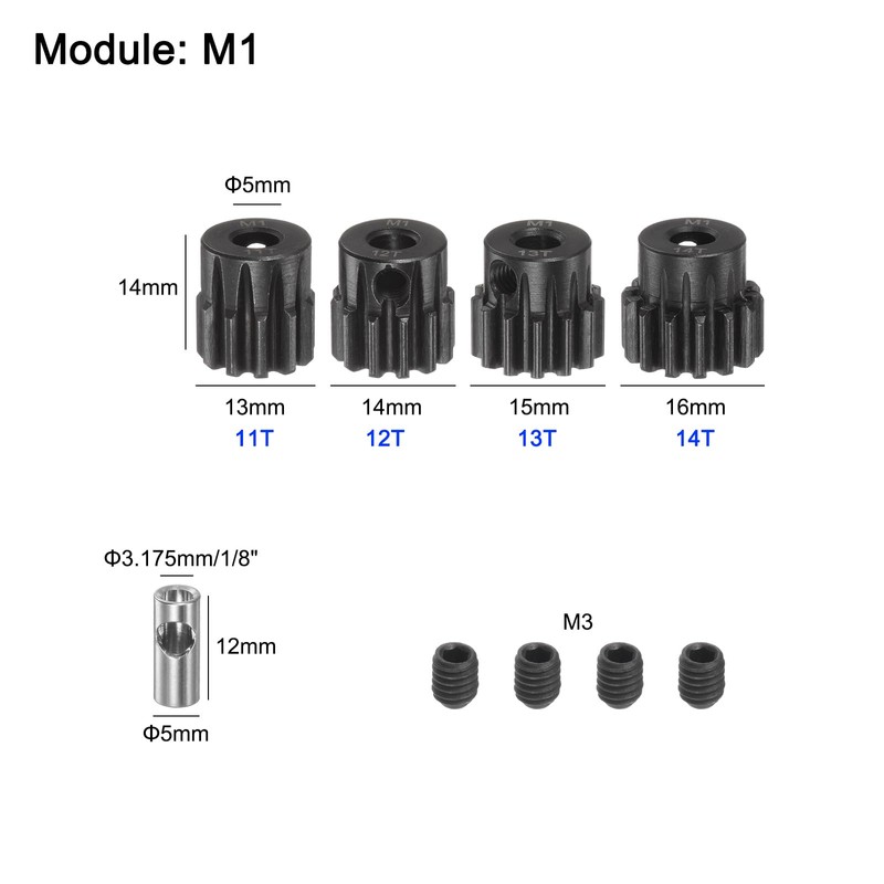 You will receive 4 pieces (11T 12T 13T 14T) pinion gear, 4 pieces grub screws, a 3.175 mm (1/8 inch) shaft coupler, and a hex key.