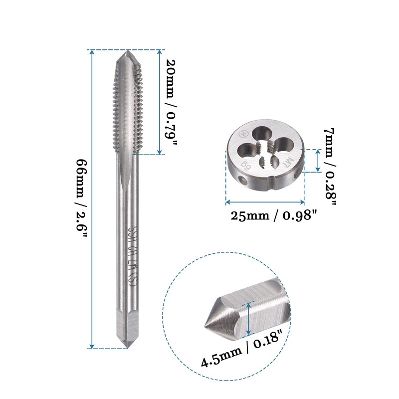 - ! Dimensions - tap: thread size: M7 x 1 mm. Thread length: 20 mm / 0.79 inches. Total length: 66 mm / 2.6 inches. Square shaft size: 4.5 mm / 0.18 inches. Round die: thread size: M7 x 1 mm. Outer diameter (AD): 25 mm / 0.98 inches. Thickness: 7 mm / 0.28 inches.